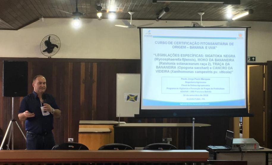 Entre os dias 25 e 26 de setembro a Adapar realizou, no Auditório Municipal, em Guaratuba, o 77º Curso de Certificação Fitossanitária de Origem e Consolidada - Banana e Uva. O objetivo foi capacitar Engenheiros Agrônomos, tornando-os aptos à habilitação para emissão do Certificado Fitossanitário de Origem (CFO) e Certificado Fitossanitário de Origem Consolidado (CFOC), de acordo com a Instrução Normativa MAPA no 33/16.
